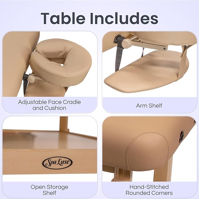 - ADJUSTABLE HEADREST AND ARM SHELF DESIGN: Professional-grade spa table featuring a European beech wood frame that supports up to 600 lbs. Perfect for massage practitioners, skincare specialists, and wellness professionals seeking a durable, non-portable workstation. The adjustable face cradle ensures proper client positioning, while the convenient arm shelf provides comfortable hand placement during sessions.