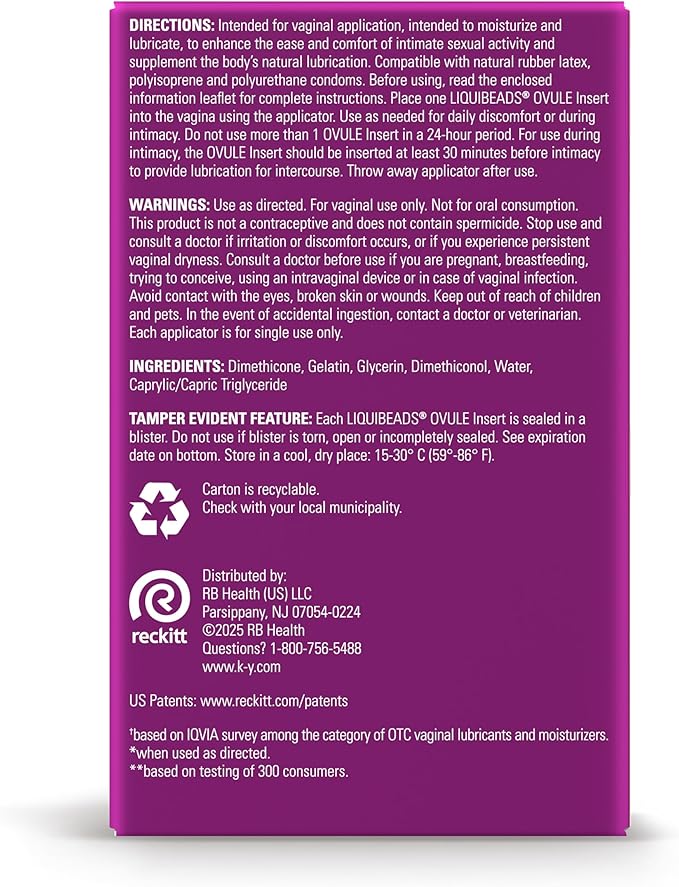 - EASY TO USE VAGINA MOISTURIZER: KY Liquibeads are a convenient vaginal suppository and come with disposable vaginal applicators, so you can say goodbye to messy tubes of vaginal cream & reusable applicators