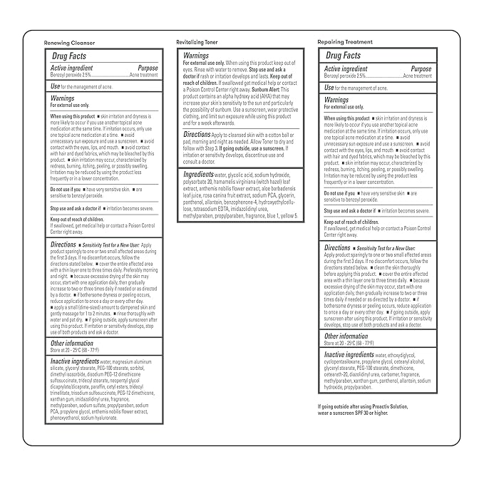 - This kit includes: Proactiv Solution Renewing Cleanser, 4 FL. OZ. ; Proactiv Solution Revitalizing Toner, 4 FL. OZ. ; Proactiv Solution Repairing Treatment, 2 FL. OZ.