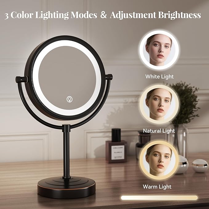 - Upgraded Dimmable 3 Color Light---- Our Dimmable lighted makeup mirror has upgraded the light strip and system, which not only with dimmable 3 color lighting---- Natural Daylight, Warm Yellow, Cool Light, but also with brighter light and higher daylight reduction index. Tap the touch control button to turn ON/OFF or change the light color, and long press to adjust the brightness to your desired brightness