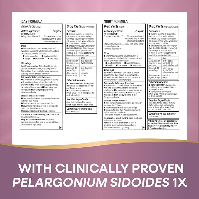 Nature's Way Umcka Cold Relief Hot Drink, Homeopathic, Clinically Proven Pelargonium Sidoides 1X, for Cough, Congestion, Sore Throat, Stuffy Nose, Day & Night Formula, 12 Packets (Packaging May Vary)