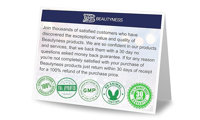 - We are so confident in our products and services, that we back them with a 30 day no questions asked money back guarantee. If for any reason you're not completely satisfied with your purchases of beautyness products just return within 30 days of receipt for a 100% refund of the purchase price.