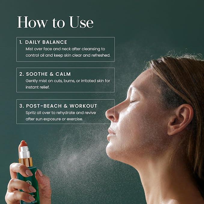 - 🌿 Multi-Purpose Toner: Calm, soothe, and hydrate acne-prone and inflamed skin with our versatile Colloidal Silver Mist Toner. Suitable for face, body, and even after waxing to reduce irritations.