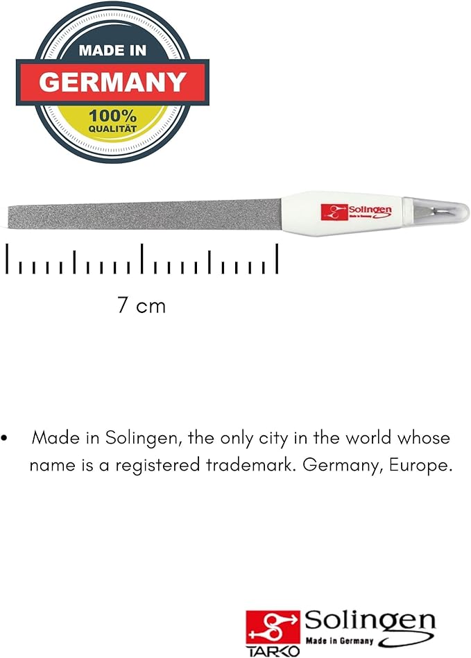 - AUTHENTIC SOLINGEN GERMAN STEEL QUALITY Crafted from durable German steel in Solingen, this nail file is built to last and maintain its performance over time. The sturdy construction ensures hygienic use, easy cleaning and long-term reliability, making it ideal for regular manicure and pedicure routines.