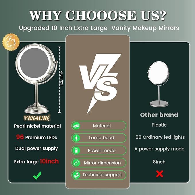 - DUAL-POWER Vanity MAKEUP MIRROR 100% BRIGHTNESS OUTPUT NO WORRIES IN CASE OF POWER FAILURE:Enjoy seamless power with intelligent dual-supply lighted makeup mirror with magnification(AC adapter or 4xAA batteries). The advanced power management chip ensures instant switching (<0.1s) for consistent 100% brightness—no dimming, even during outages. CE/FCC-certified for safety,make up mirror perfect for home or travel, freeing you from cords while delivering reliable, high-quality lighting anywhere
