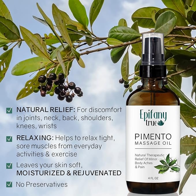 - MASSAGE BODY OIL: Epifany True Pimento Massage Oil is a natural and traditional oil blend, originally from the Caribbean, and may be used as a topical relief of discomfort in joints, neck, back, shoulders, knees, and wrists. May be used as a massage oil for massage therapy.