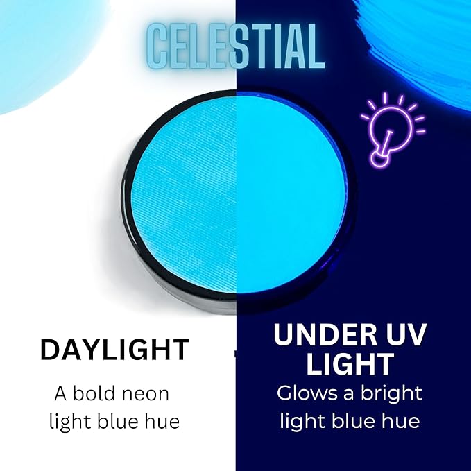 - MULTIPLE COLORS: This makeup offers a kaleidoscope of neon & metallic colors and finishes. The perfect Blacklight reactive makeup and shimmering metallics for Halloween, cosplay, Special FX, & more.