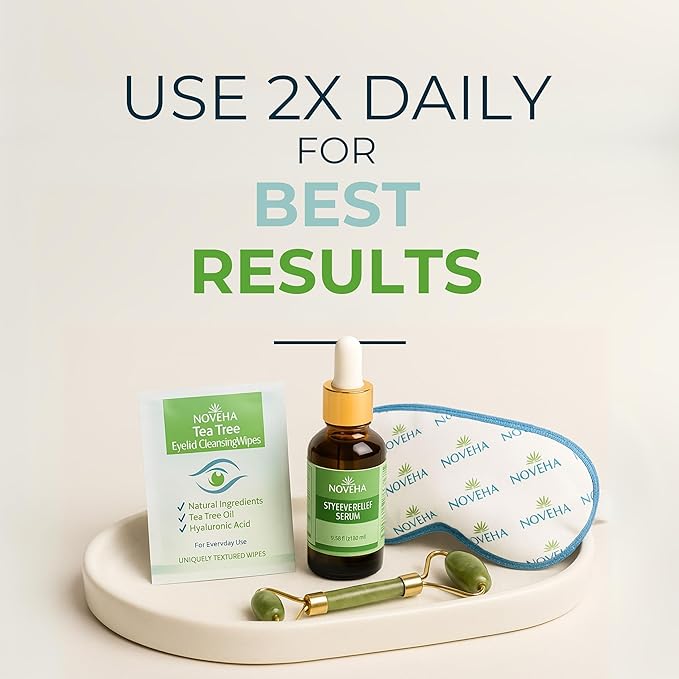 NOVEHA 180PCs Tea Tree Oil Eyelid & Lash Wipes With Hyaluronic Acid, Green Tea & Chamomile For Blepharitis & Itchy Eyes, Individually Wrapped Eyelash Wipes Natural Makeup Remover & Daily Cleanser