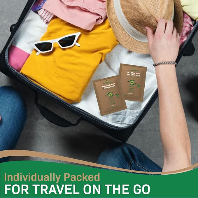 NOVEHA 60PCs Tea Tree & Coconut Oil Eyelid & Lash Wipes - For Demodex, Blepharitis & Itchy Eyes, Individually Wrapped Eyelash Wipes With Aloe Vera, Natural Makeup Remover & Daily Eye Cleanser