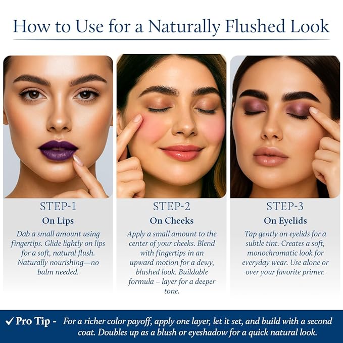 - 3 in 1 Lip, Cheek Eye Tint: This multifunctional product can be used as a lip stain for a dramatic effect, a cheek stain blush for a rich, rosy glow, or a bold eye tint for a striking look. Its creamy, blendable formula ensures a flawless finish every time.