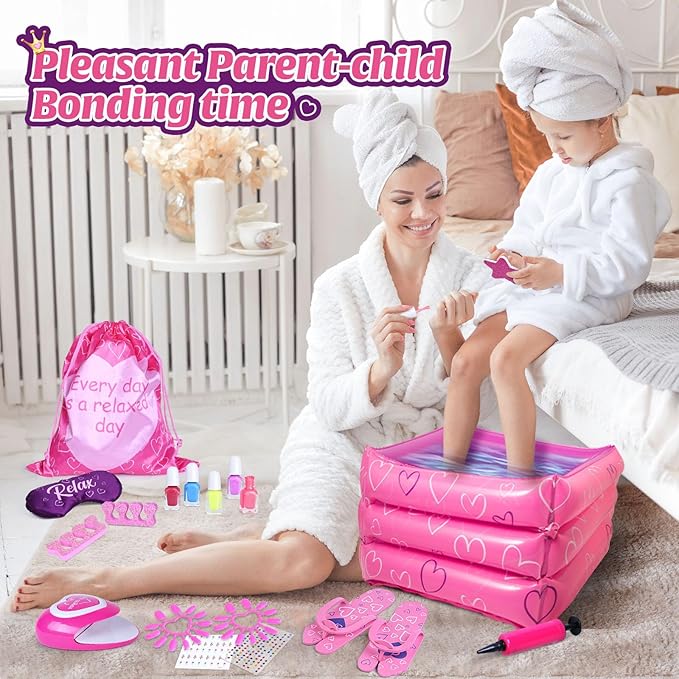 - ENDLESS SPA FUN for ALL AGE: Have your girly spa party at home with family or friends. Soak your feet in the water inside the inflatable tub while relaxing with an eye mask on. You will feel so relaxed and fun. The spa set is suitable not only for kids, but also parent-child time or girl's party. No matter the age, all people will enjoy it. Get the great gifts for your girls and create a fabulous spa exprience with her!
