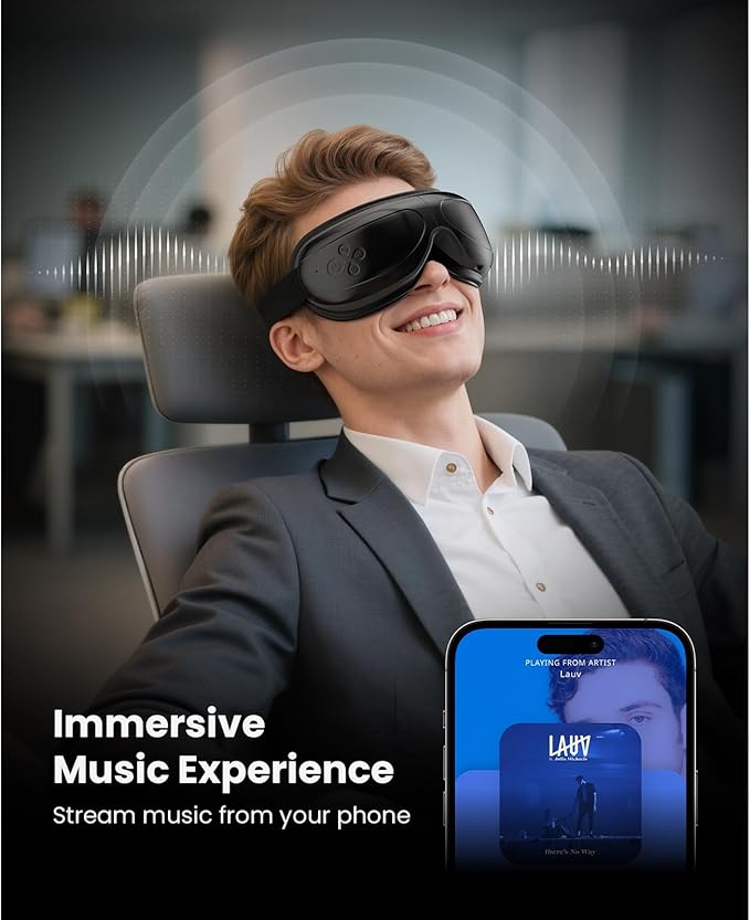 - Quieter Motor & Customizable Music - Our upgraded electric eye care device incorporates low-noise technology reduces audible noise from 60dBA to just 45dBA, so that you can enjoy a low-noise, comfort, warm nap. The built-in white noise music helps to reduce anxiety and can be turned off at your convenience. You can also connect the massager to your phone or tablet to play your own playlist. Simply wear it for 15 minutes before going to bed every night to relax and enjoy a better night's sleep