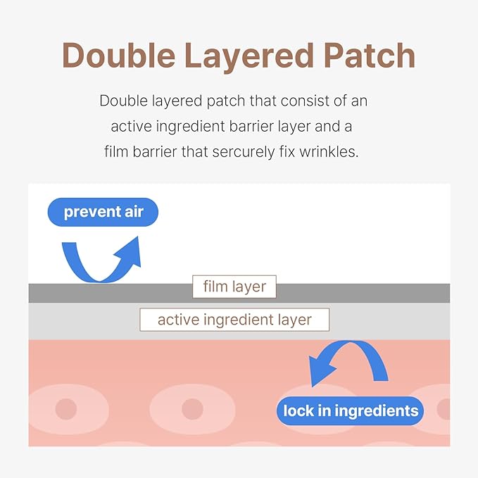 - [Patch composed of two layers] The two-layer patch consisting of an active ingredient layer and a film layer helps to fix wrinkles and prevent the active ingredients from evaporating.