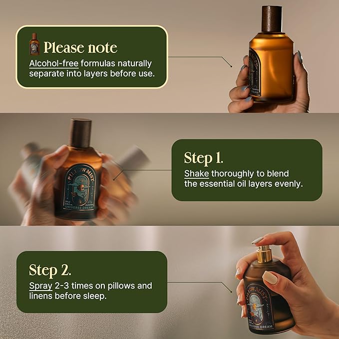 - [Effortless Usage]Create a sleep sanctuary by spraying 3 times at a gentle distance on your pillows, fabric, linens, and beddings with our bedding spray. Safe and hypoallergenic, our sleep spray for pillows uses no harsh chemicals, ensuring a soothing experience for a peaceful night