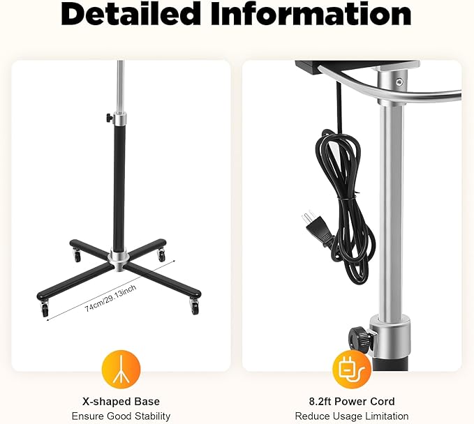 - Stable Placement: The crucifix-shaped base made of iron has good stability and is not easy to tilt and collapse. At the same time, the adjustment rod is made of stainless steel, which is firm and hard for stable use.It is equipped with a handle and four silent universal casters that allow you to move it easily.