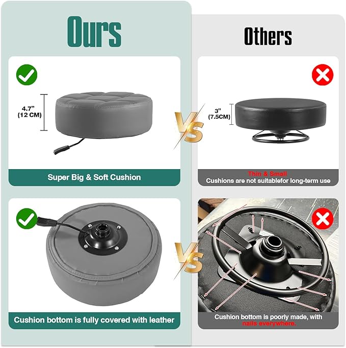 - Super thickened cushion and High-quality leather : Unlike those rolling stool that claim comfort but only provide thin (2"-3") and small cushions, we offer a truly super large and thickened cushion (4.7")which will essentially provide real comfort, not false promises. As shown in the video, this stool chair cushion is scratch-resistant and has a delicate touch, ensuring a very good experience for a long time.