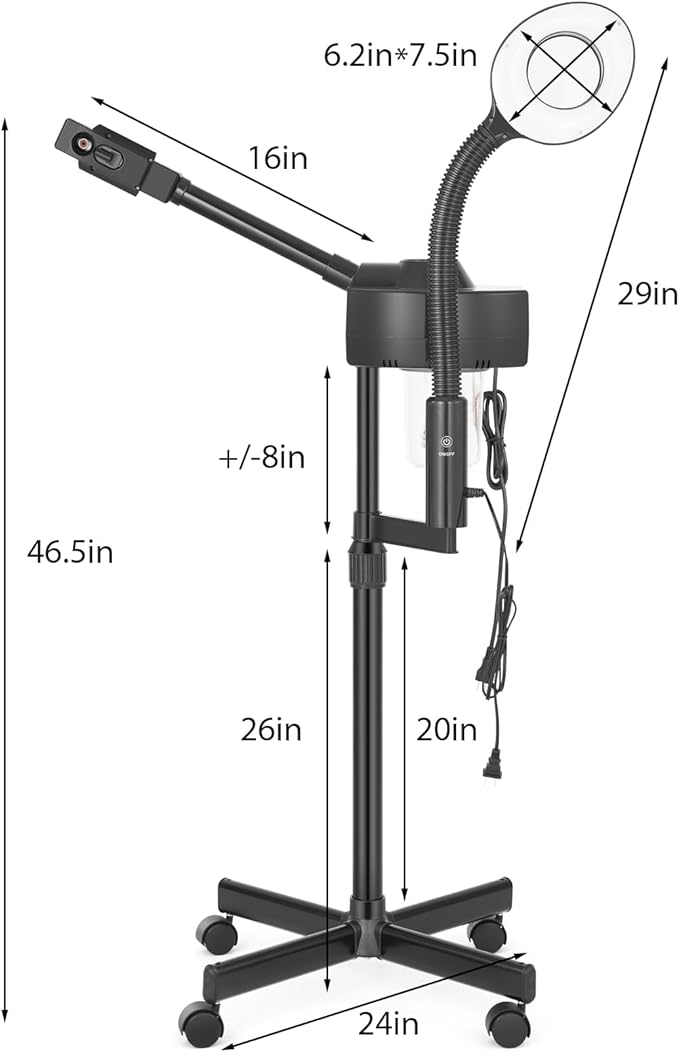 - 【Convenient Design】: Adjustable height and swivel nozzle can be adjusted to any angle you need, the nozzle of the face steamer for facial can be rotated 360 degrees, and 4 low noise wheels can be moved freely anywhere.