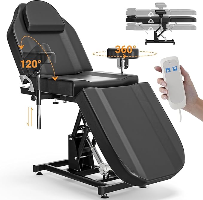 - ELECTRIC TATTOO CHAIR w/REMOTE CONTROL:With a remote control, you can easily raise or lower this Electric Facial Bed chair from 20.1" to 33.5", providing more flexibility and more convenience to estheticians. Additionally, you can effortlessly adjust the backrest 65°and legrest to 50°to find ultimate comfortable position for your clients.
