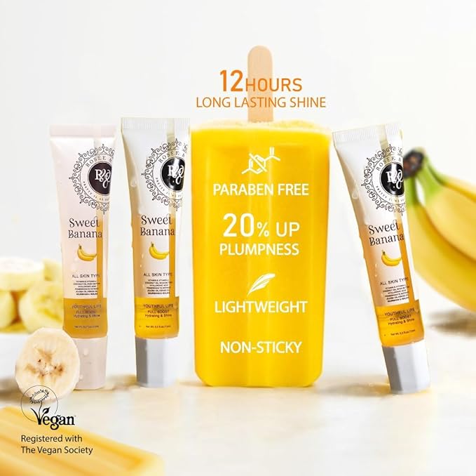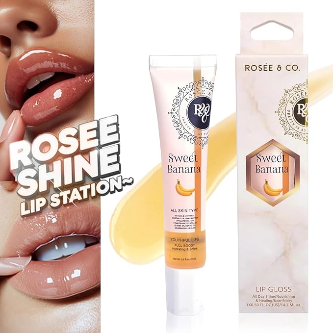 Rosee Lip Gloss Vegan & Cruelty Free Treatment, Professional Make up, Long Lasting Glossy with Shea Butter, Moisturize, Protect & Smooth, High Shine, Non-Sticky (s. Sweet Banana, 0.5)