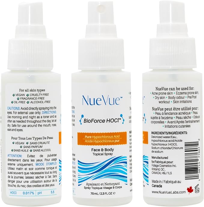 BioForce HOCl - Pure Hypochlorous Acid Spray for Face Travel Size Toner & Cleanser - Made in Canada - Acne-Prone Skin & Eczema, Piercing aftercare, pH Balanced, Non-comedogenic - NueVue (2.3 oz)