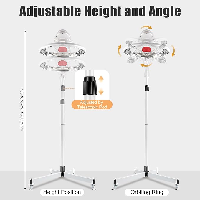 - Adjustable Height and Angle: You can adjust the hair dryer's height position (53.15-65.75inch) at will with the black adjustment button. In addition, the 360° rotatable ring can be telescoped and tilted to provide a full range of heights and angles for any user.
