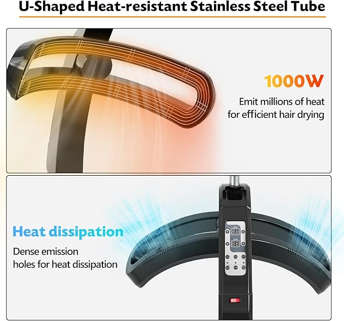 - 【Professional Hooded Dryer】1000W U-shaped heating tube symmetrical design for better uniform heating. 360° rotatable; Fixed angle 45°/90°/180°adjustable. Internal circulation system allows the airflow to penetrate the inside of the hair, reduce drying time while simultaneously conditioning your clients’ hair giving them a silky smooth and voluminous texture, good for both straight and curly hair