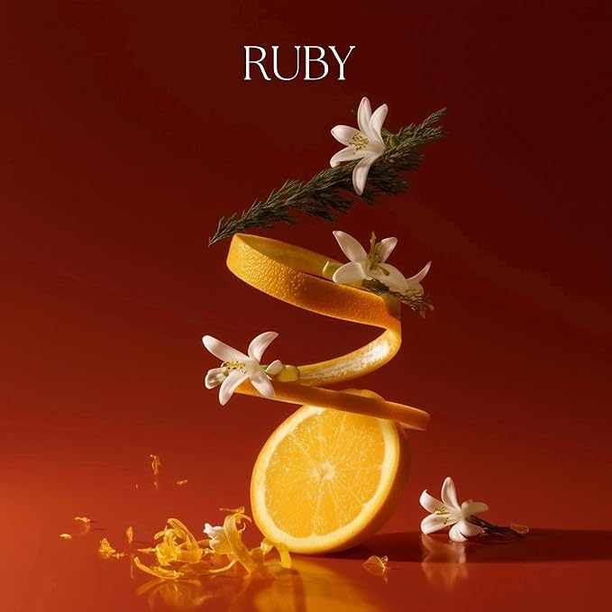 - REFRESHING BLENDS YOU’LL LOVE: Inspired by the timeless elegance of Baccarat Rouge, Ruby blends bright orange rind, delicate jasmine, and warm saffron. Deep amber, oakmoss, and fir add richness, creating an air of sophistication and warmth.