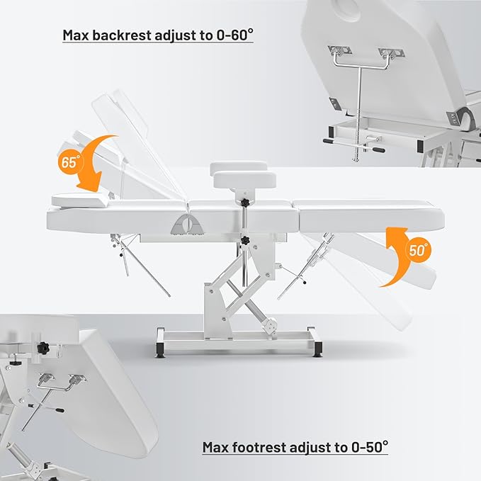 - ADJUSTABLE DESIGN FOR COMFORT & VERSATILITY: With a 3-section construction, our electric tattoo bed for esthetician allows for precise adjustments to cater to different client needs. The adjustable backrest (0-60°) and footrest (0-40°) allow for optimal positioning, ensuring maximum relaxation during massages or other esthetician services.