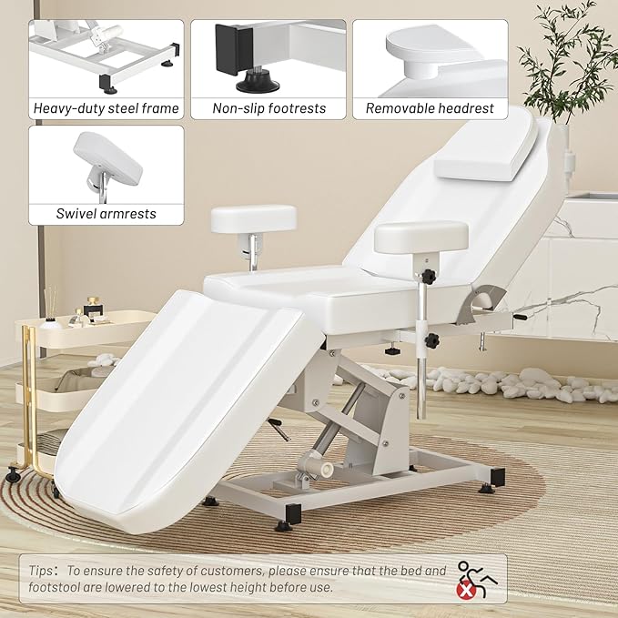 - REMOVABLE HEADREST & ADJUSTABLE ARMRESTS FOR MULTI-PURPOSES: The removable headrest with face hole offer added convenience and versatility during beauty services, which facilitate free massage postures conversion.It's not only provides added comfort for your clients, but also makes it convenient for you to perform eyelash extensions,facial care, massage, tattoo, spa, waxingor other beauty treatments.