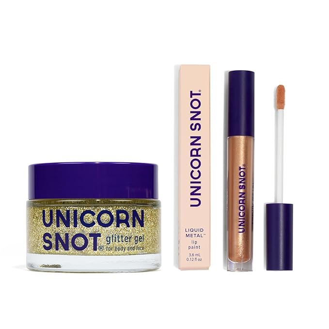 UNICORN SNOT Glitter Gel & Glitter Liquid Metal Lip Paint Bundle - Makeup for Festivals, Raves, Anime Cosplay - Safe for Face, Easy Application & Removal (Bling & Dune)