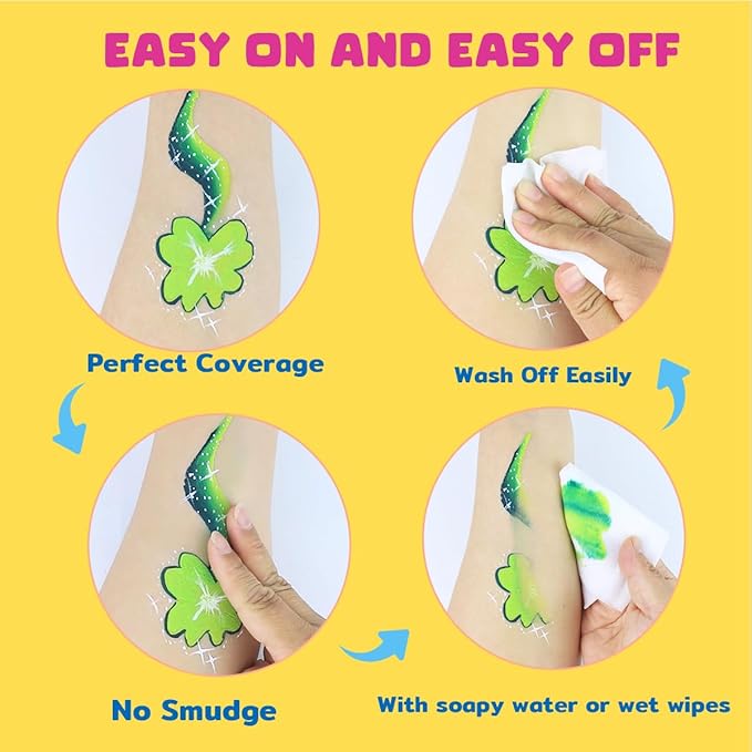 - Easy to use and wash off:Our face paints are water activated and dries fast with extremely pigmented,provide long lasting,smooth and excellent coverage,less prone to fading or cracking.Different from cleaning wax-based or oil-based painting,you can easy wash off with soap and water or wet wipes.