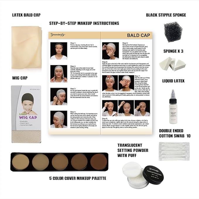 - Paminify Bald Cap Makeup Kit:Paminify Halloween Makeup Kit includes :Latex Bald Cap,Wig Cap,Liquid Latex,Translucent Setting Powder with Puff,5 Color Cover Makeup Palette,Sponge*3,Black Stipple Sponge,Double Ended Cotton Swab*10, and Step-by-Step Makeup Instructions-everything for professional-grade undead transformations