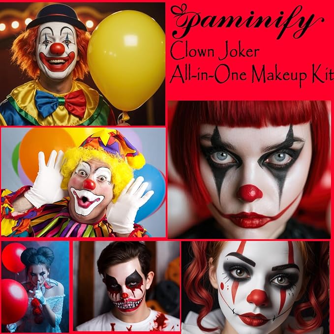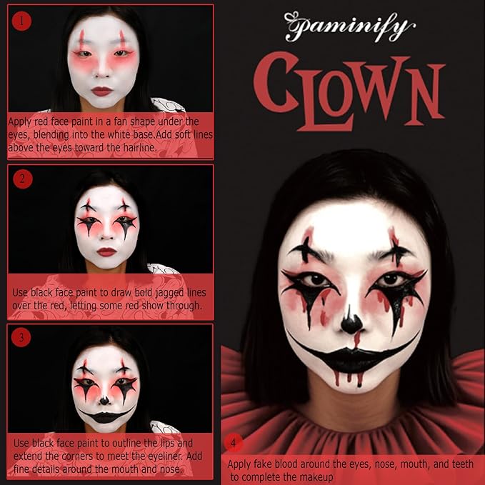 - Paminify Clown Makeup Kit:Paminify Dead Clown Makeup Kit includes 30ml Black, White, & Red Face/Body Paints, Translucent Setting Powder with Puff, Realistic Fake Blood, 3 pcs Versatile Sponge, Medium & Small Detail Brushes, plus easy-to-follow Step-by-Step Makeup Instructions