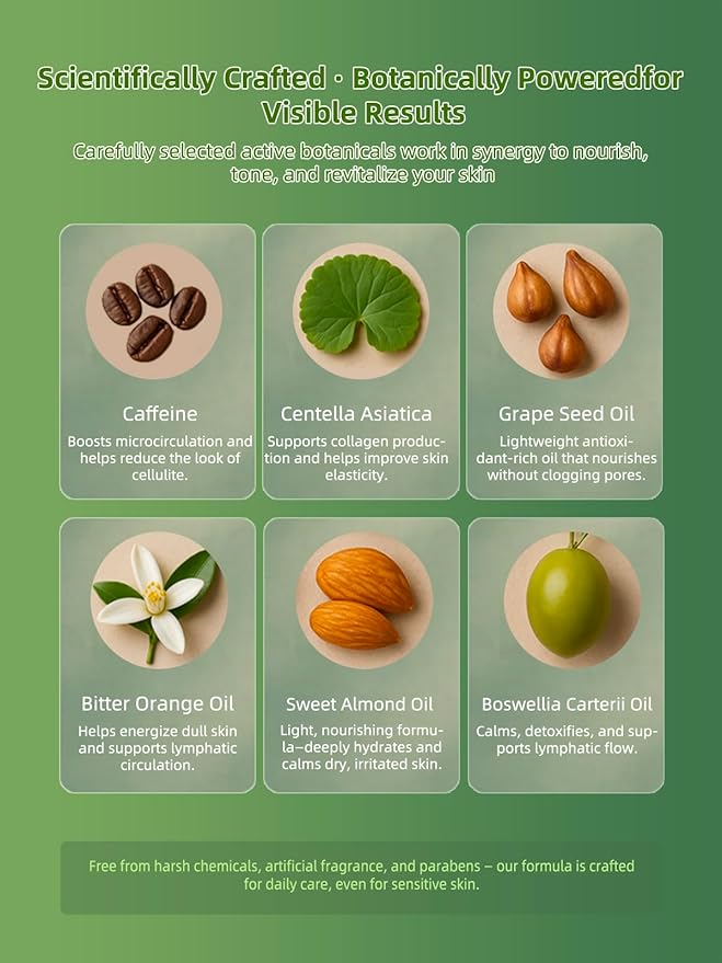 - 4-in-1 Botanical Formula – Smooth, Detox, Firm, Nourish: Powered by caffeine, centella asiatica, bitter orange oil, and a blend of nourishing carrier oils, this multi-action formula helps reduce cellulite, support lymphatic flow, tighten skin, and deeply hydrate.
