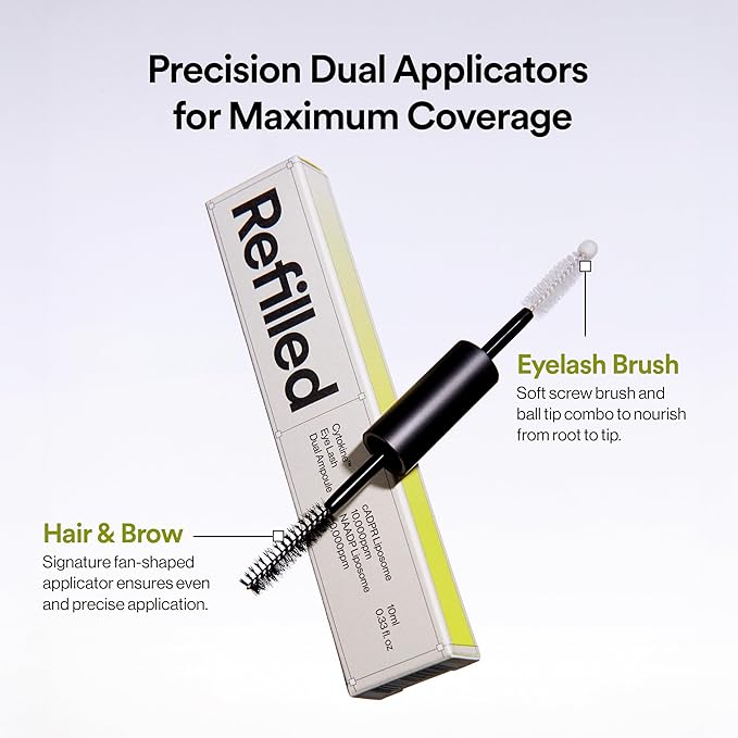 - DUAL‑ENDED APPLICATOR TARGETS BOTH LASHES & BROWS: A slim, eyeliner‑style brush lays down serum precisely at the upper and lower lash roots, and a micro‑detail tip lets you dot sparse brow tails or tight spaces between individual lashes. No dripping, no waste—just controlled, mess‑free dosing in seconds. The compact 10 ml tube travels easily so you never miss a nightly application, the key to consistent results.