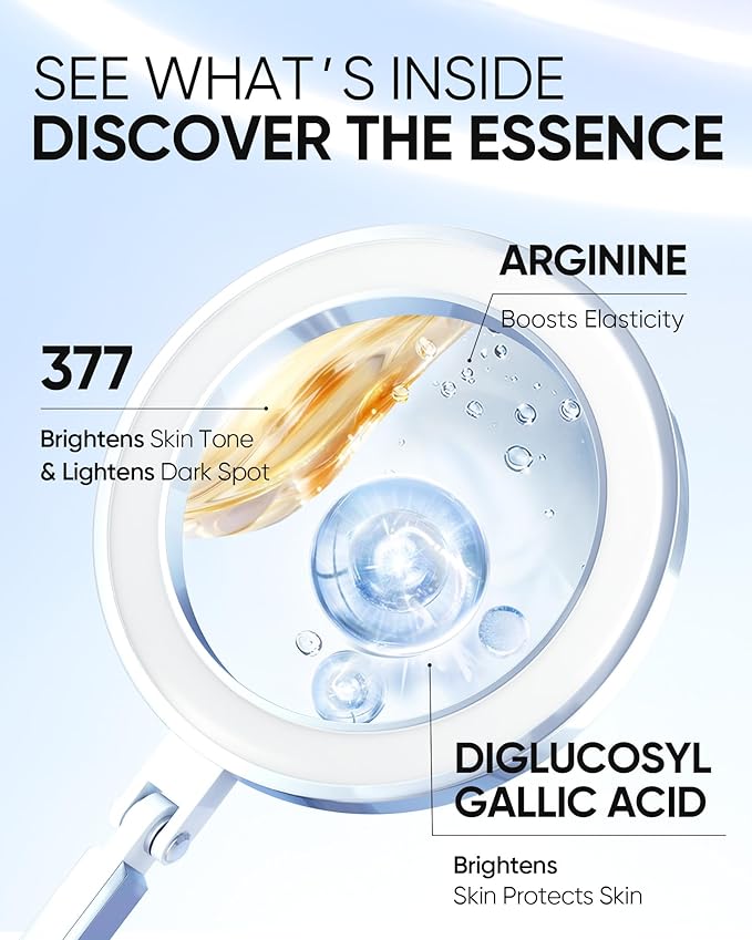 - REDUCES DARK SPOTS – Formulated with 377 (Phenylethyl Resorcinol) and Diglucosyl Gallic Acid to target hyperpigmentation, lighten dark spots, and promote a more uniform complexion over time.