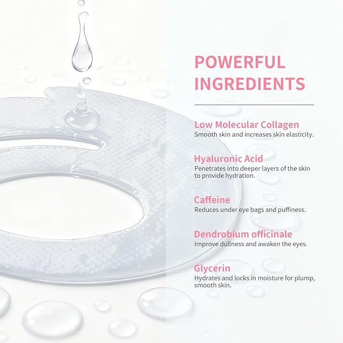 - Dark Circle Relief: Our eye patches contain caffeine, which can reduce and soften eye bags. Use it in the early morning to immediately awaken your tired eyes, allowing you to bid farewell to your weariness and stay confident all day long