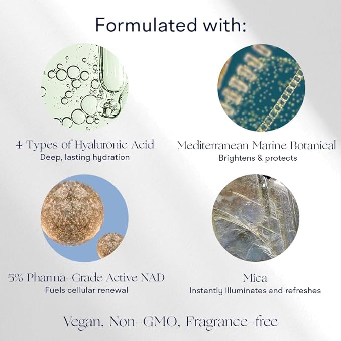 - VEGAN AND FRAGRANCE-FREE – Made with NAD+, hyaluronic acids, Mediterranean botanicals, hawthorn, Arabian jasmine, and mica, this vegan serum fits seamlessly into modern skincare practices.