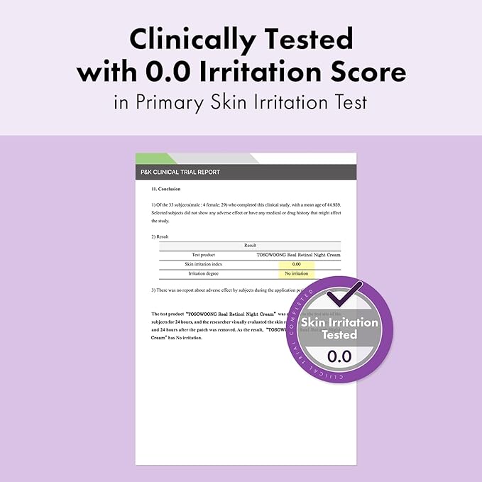 - [Skin Irritation Tested – Score 0.0] This cream has been clinically tested by a certified lab. Gentle yet effective, it’s safe even for sensitive or easily reactive skin, providing soothing and hydrating care without irritation. However, since it contains retinol, patch test on the body is recommended before applying it to the face.
