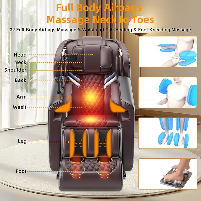 - 【Full Body Airbags Massage Chair】Air soothing airbags and 4D massage technology replicate a human massage experience with 5 modes, 5 techniques, and 32 airbag points covering the entire body. Three levels of airbag pressure compress the shoulders, arms, buttocks, calves, feet, and ankles, relieving body pain. Massage chair uses thermotherapy heating in the waist & calf areas to relieve soreness, and roller massage on the soles of the feet relaxes fatigue