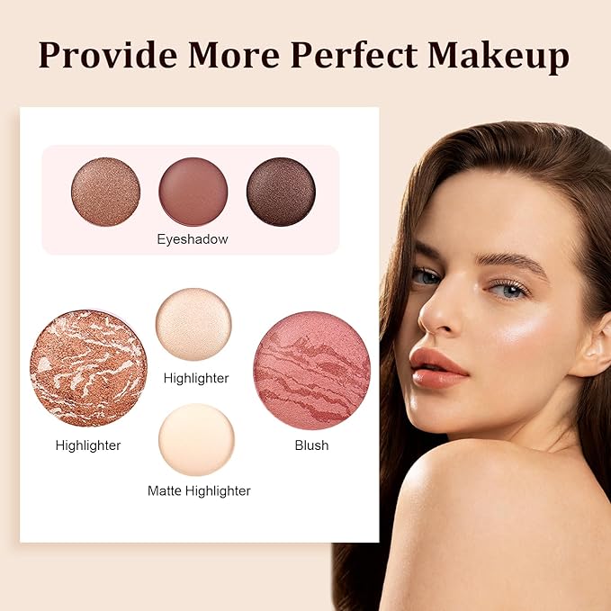 - All-in-one Baked Palettes: All in one makeup palette includs 3 highlighters 3 eyeshadows and blush, contains glow and matte smooth texture. Features a curated selection of matte and shimmer fit for most of skin tones.