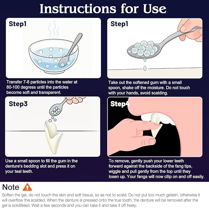- 【Easy to Use】Place the teeth adhesive beads into hot water until they turn from white to clear. Remove, press onto the fake fang to create a mold, then apply the fang to your teeth. Detailed instructions and diagrams are available in the package.
