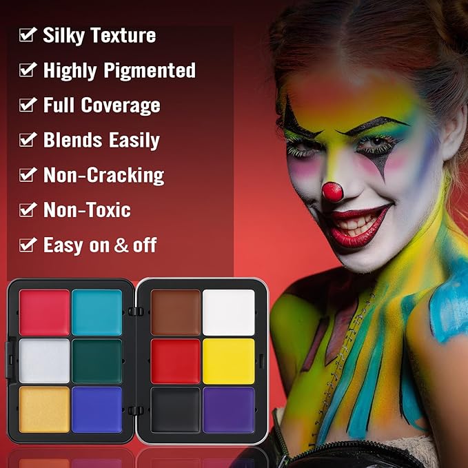 - SAFE & SKIN-FRIENDLY INGREDIENT- Vegan and cruelty-free. This Halloween face makeup kit is made with a gentle, all-natural formula that is hypoallergenic, gluten-free, non-toxic and non-irritating. Suitable for sensitive skin and all skin types. Warm Tips: Please perform a patch test before use. Additionally, as this is an oil-based face paint, we strongly recommend using it with a setting product to make the makeup last longer and avoid smudging and transfer