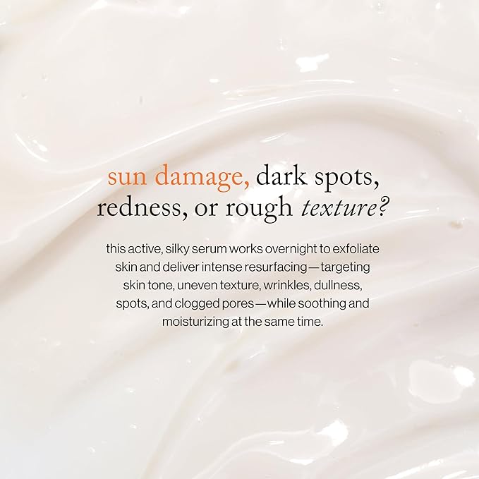 - Exfoliating Serum: This silky, stealthily effective 10% glycolic and lactic acid serum works overnight and over time to exfoliate, resurface, and moisturize, leaving your skin glowy, smooth, practically poreless, and baby-soft.