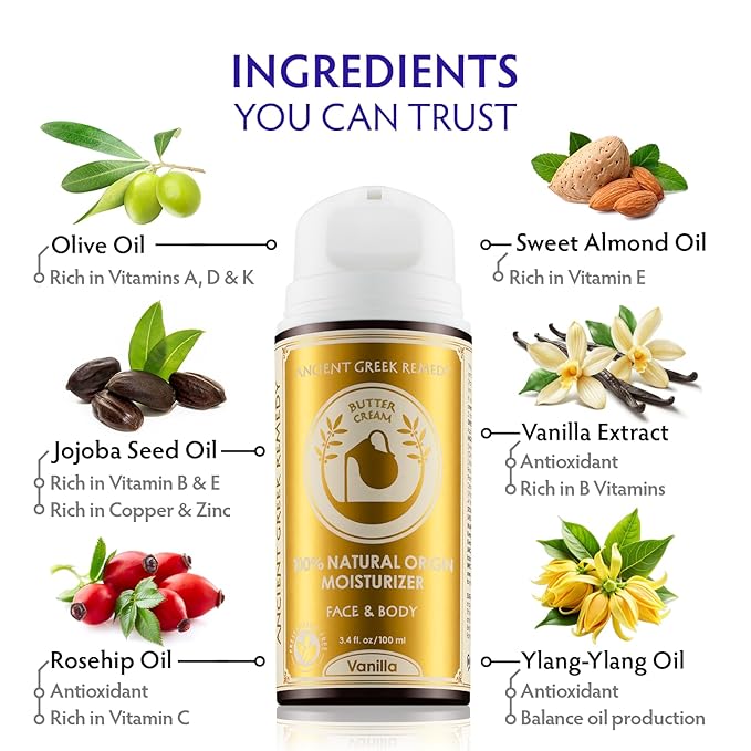 Ancient Greek Remedy Vanilla Butter Cream - Organic Body & Face Moisturizer with Sweet Almond, Jojoba & Rosehip Oils, 100% Natural Origin, Vegan, No Synthetic Fragrance 3.4 oz