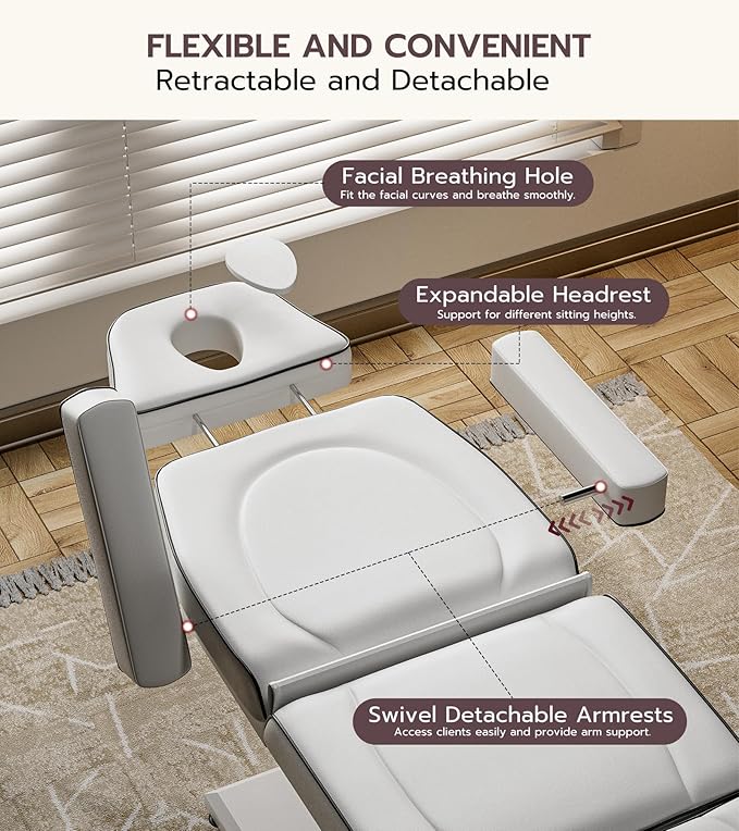 - Client-Centered Design: Thoughtful details include swivel armrests for easy client access (no need to remove), an adjustable headrest for personalized neck and head support, and an oval-shaped breathing hole that better conforms to facial contours — enhancing client comfort during every treatment
