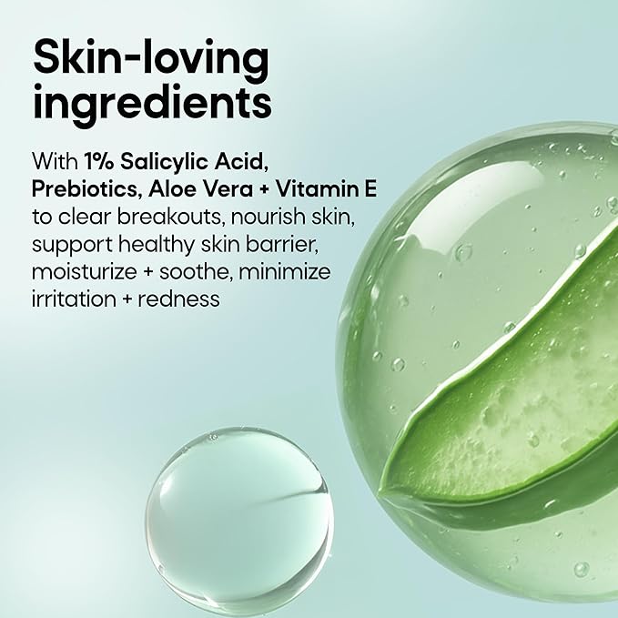 - SKIN-BALANCING INGREDIENTS: Formulated with 1% Salicylic Acid, Prebiotics, Aloe Vera and Vitamin E. Salicylic Acid helps clear breakouts, Prebiotics nourish skin and support a healthy skin barrier. Aloe Vera soothes and moisturizes—minimizing the appearance of dryness and redness