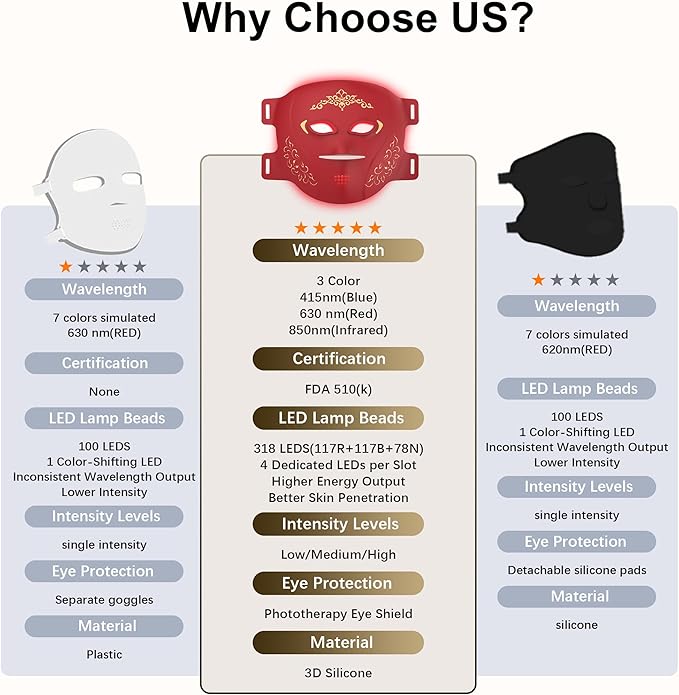 - [Professional-Grade LEDs] Unlike other LEDs masks with color-changing lights that blend or switch, our red light mask features independent red, blue, and near-infrared LEDs for precise, targeted therapy. Equipped with 117 red LEDs, 117 blue LEDs, and 78 near-infrared LEDs, it delivers specific wavelengths that are tailored to address unique skin concerns, maximizing therapeutic results and ensuring professional-grade effectiveness.
