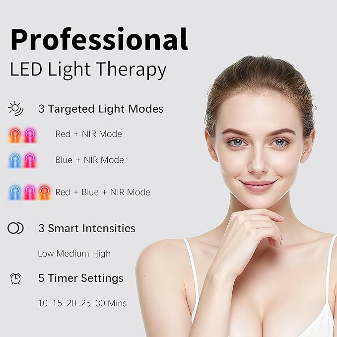 - [3-Modes & Adjustable Intensity] Red + NIR for full-face wrinkles, Blue + NIR for acne, and Red + NIR + Blue for combined wrinkle and acne treatment. Red and infrared light reduce wrinkles, while blue light targets mild to moderate acne for complete skin care. 3 brightness levels to customize for your skin