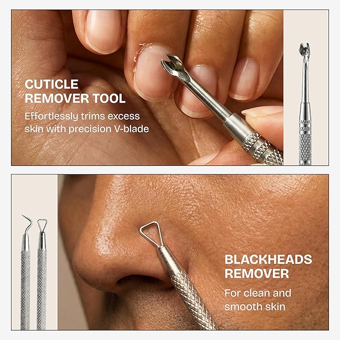 - [PROFESSIONAL 9-IN-1 GROOMING KIT]: This all-in-one manicure and pedicure set includes premium tools designed for complete hand, foot, and facial care. Featuring Nail Clippers, Oblique Clipper, Cuticle Nipper, Nano Nail File, Nail Scissors, Tweezers, Cuticle Pusher, Blackhead Removal Tool, and Cuticle Remover, it provides everything needed for a polished, salon-quality grooming experience at home or on the go.